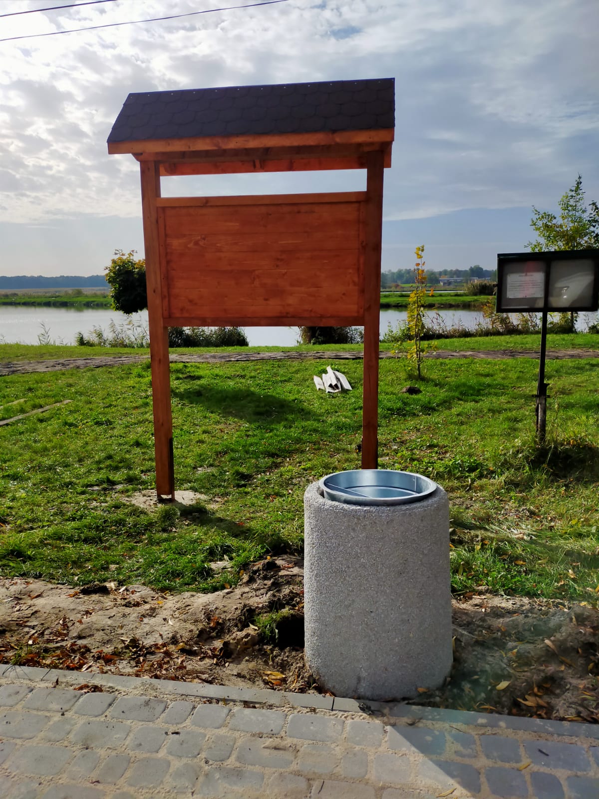 8) Wykonaniu i montażu elementów małej architektury – 8 ławek drewnianych, 10 koszy na śmieci, 3 tablic informacyjnych, 2 stojaków na rowery.