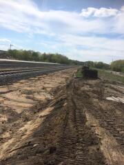 2) wybraniu materiału ziemnego po byłym peronie na międzytorzu torów nr 2 i nr 4 w km od 101,860 do 102,130. Obmiar: szerokości około 0,5 m i wysokości około 0,8m. Wybranie ziemi (do poziomu istniejącej przed robotami niwelety toru nr 2) w pasie przy zachowaniu ciągłej odległości od osi toru nr 1, co najmniej 6,6 m. Wybranie skarpy pochylonej pod kątem 45 stopni, uniemożliwiającej osuwanie się niewybranej części peronu ziemnego. Szacowana objętość materiału ziemnego to - 270m x 0,5 m x 0,8m = 108 m3,